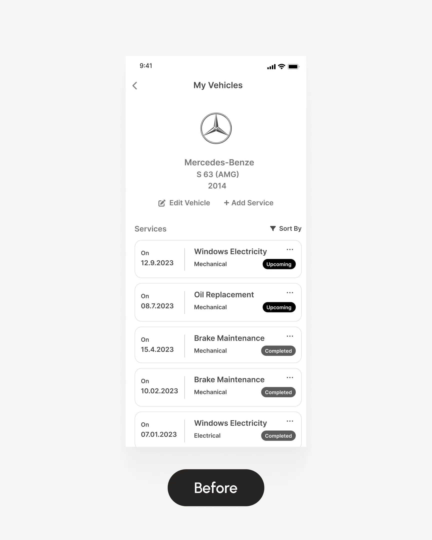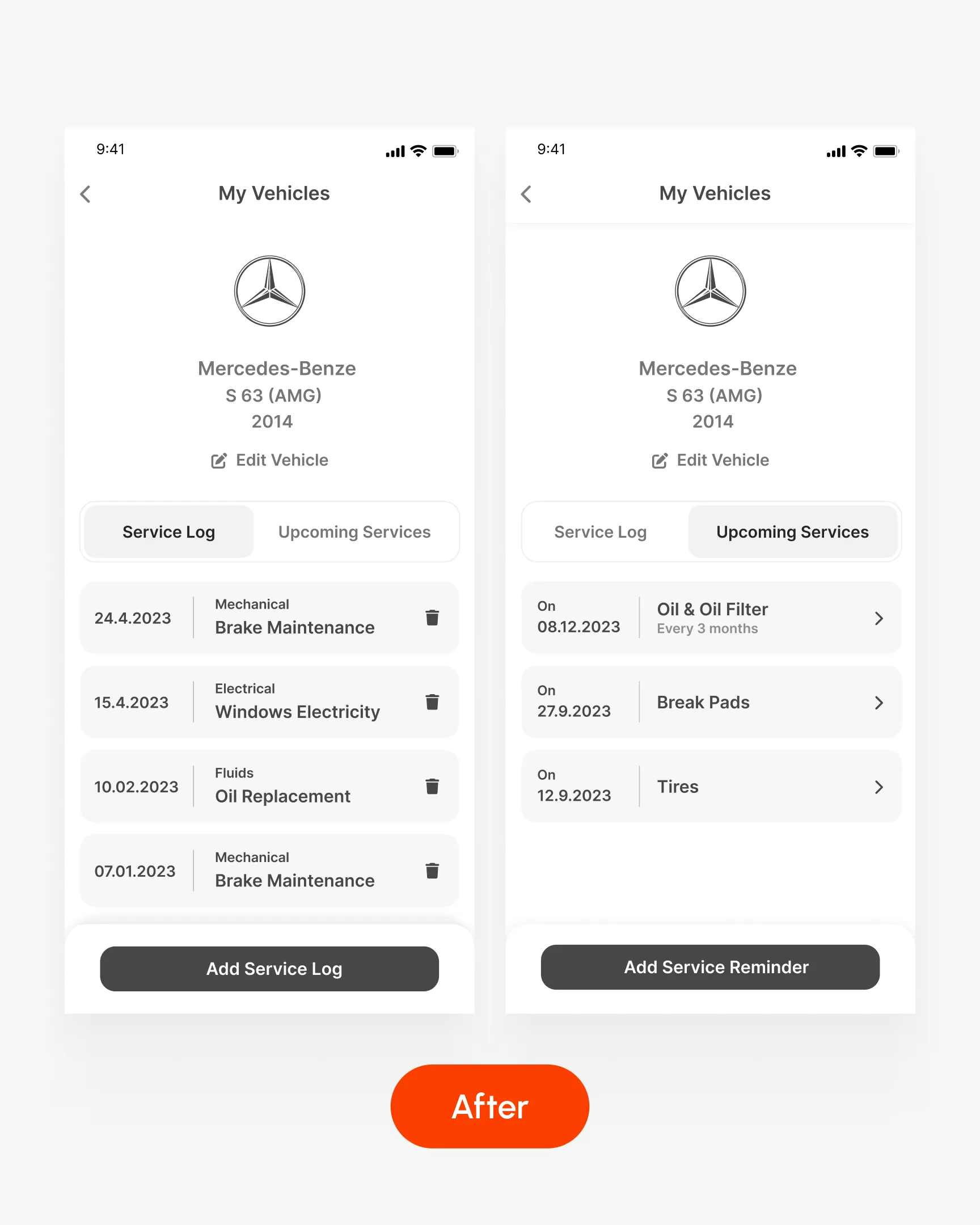 The screen was split into Service Log and Upcoming Services. Actions became directly accessible, recurring services were clickable, and adding or deleting entries became simpler and clearer.